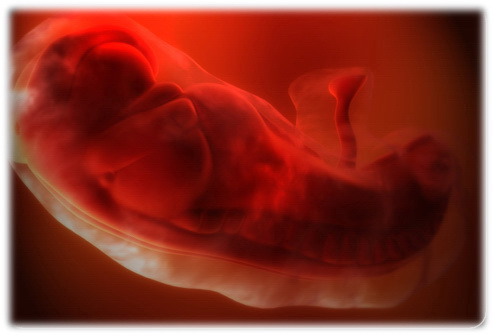 ثمانية أسابيع .. يدق قلب الجنين بشكل منتظم الآن وغالبية الكتل الجسديه بدأت بالتصّور. العينين تتقدم إلى الأمام ، الأعضاء التناسليه بدأت بالتطور ويمكننا رؤية الحبل السري بوضوح. طول الجنين هو قرابة 2.54 سنتيمتر ووزنه 3.5 غرام